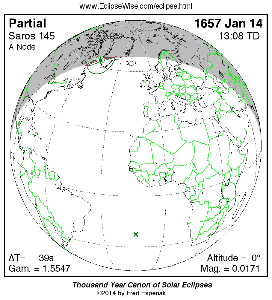 - Orthographic Map: Partial Solar Eclipse of 1657 Jan 14 - global map of eclipse visibility