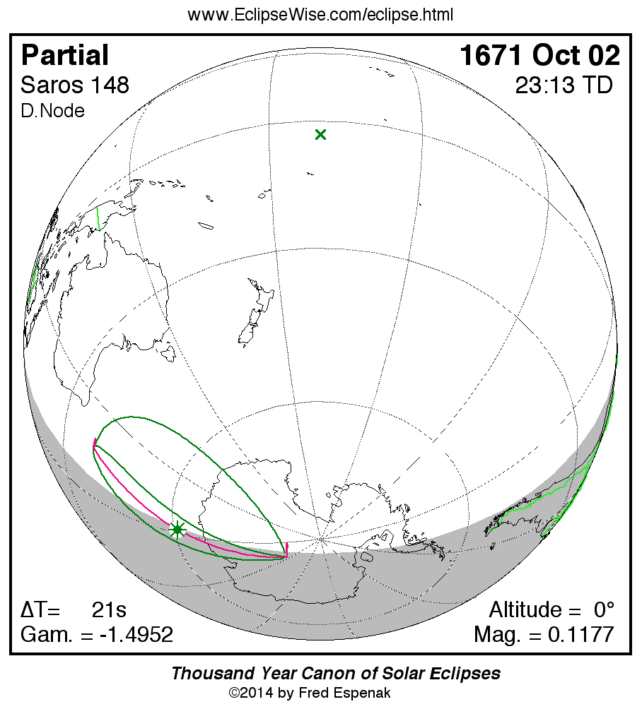 The instant of greatest eclipse takes place on 1671 Oct 02 at 23:13:21 TD (23:12:60 UT1).