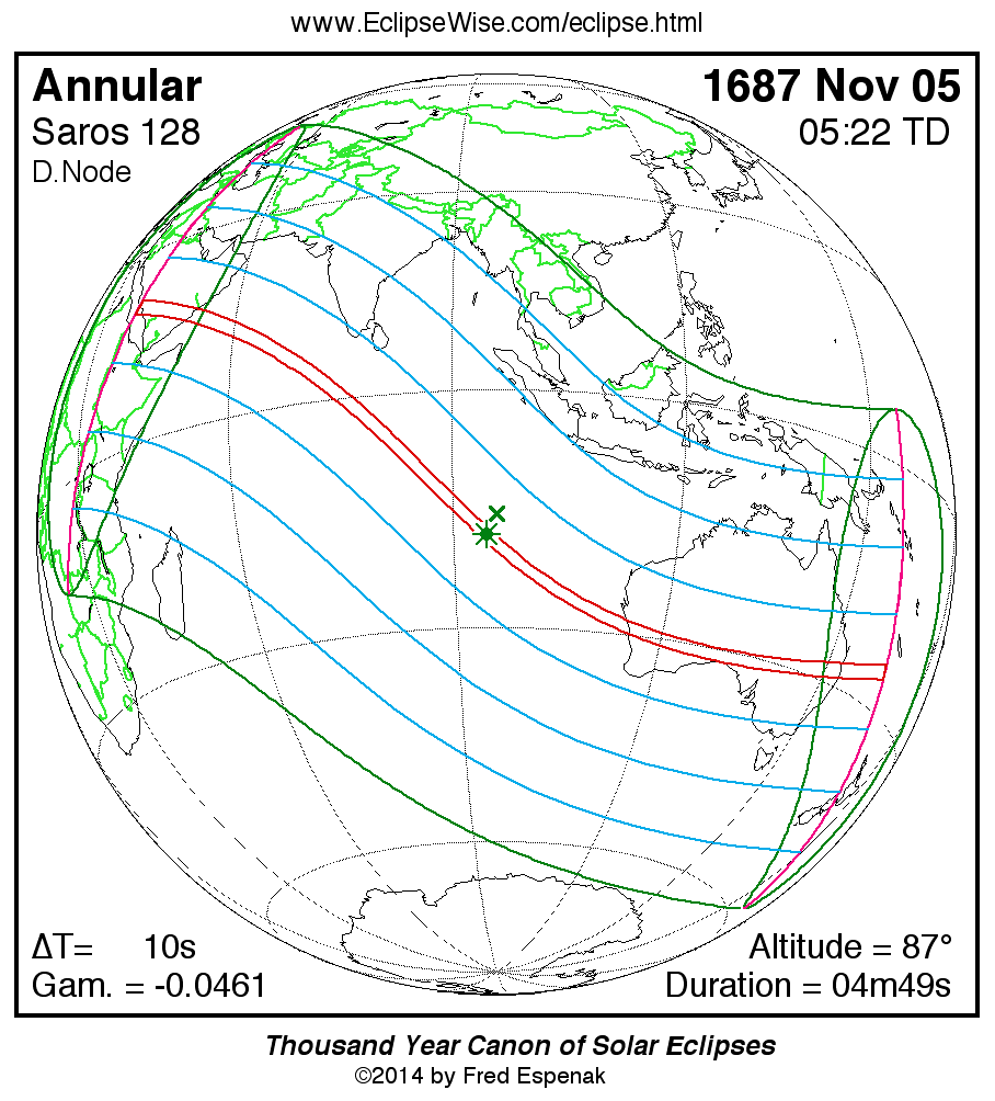 The instant of greatest eclipse takes place on 1687 Nov 05 at 05:22:24 TD (05:22:14 UT1).