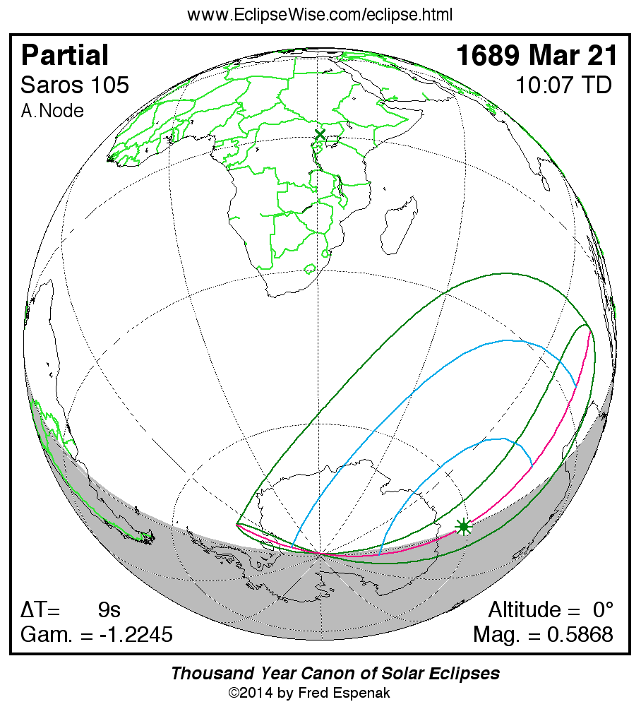The instant of greatest eclipse takes place on 1689 Mar 21 at 10:06:41 TD (10:06:32 UT1).