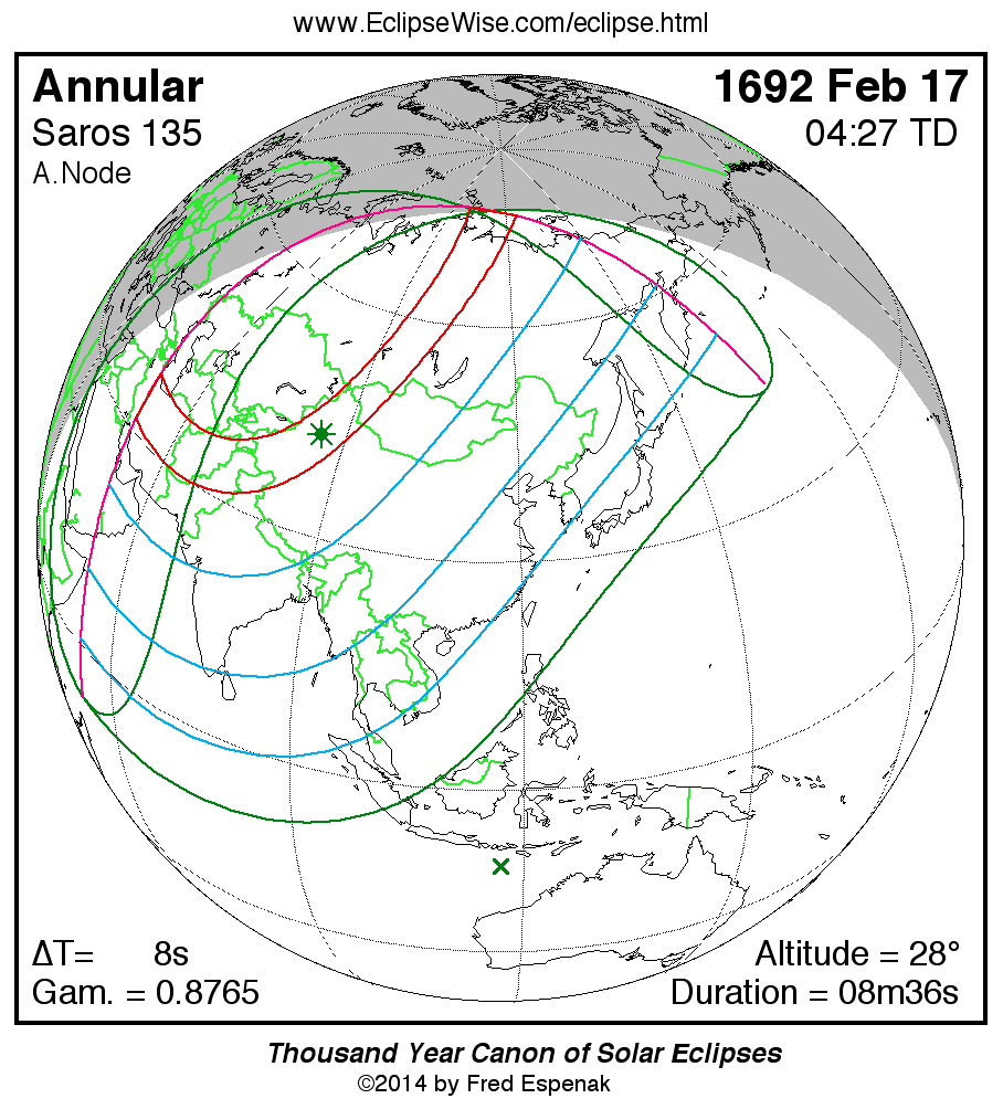 - Path Table: Annular Solar Eclipse of 1692 Feb 17 - coordinates of the central line and path limits