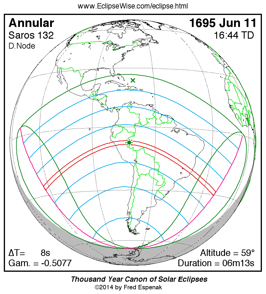 - Orthographic Map: Annular Solar Eclipse of 1695 Jun 11 - global map of eclipse visibility