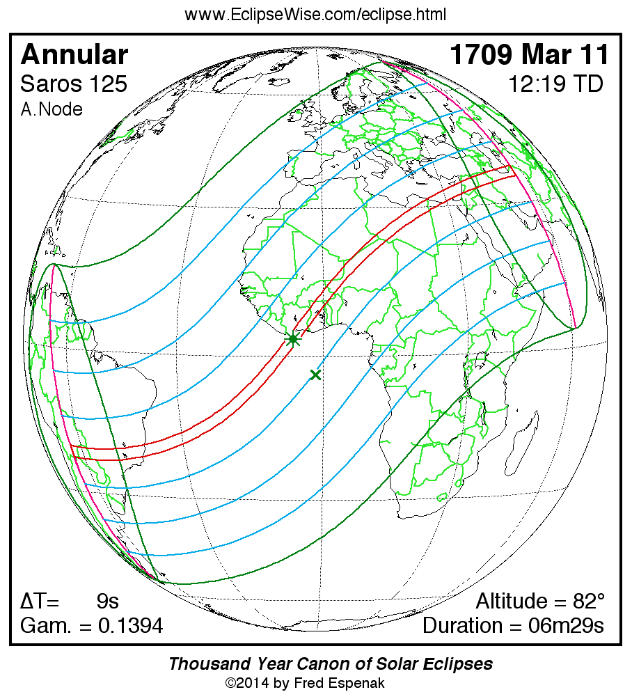 - Google Map: Annular Solar Eclipse of 1709 Mar 11 - interactive map of the eclipse path