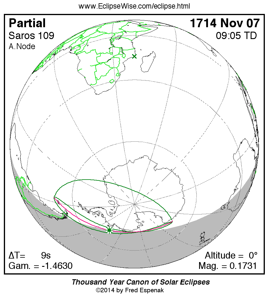 The instant of greatest eclipse takes place on 1714 Nov 07 at 09:04:34 TD (09:04:24 UT1).