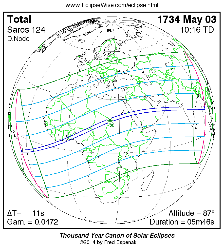 - Path Table: Total Solar Eclipse of 1734 May 03 - coordinates of the central line and path limits
