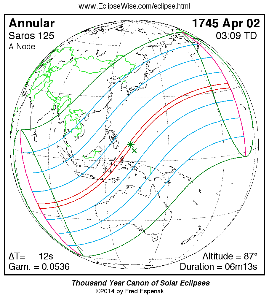 - Path Table: Annular Solar Eclipse of 1745 Apr 02 - coordinates of the central line and path limits