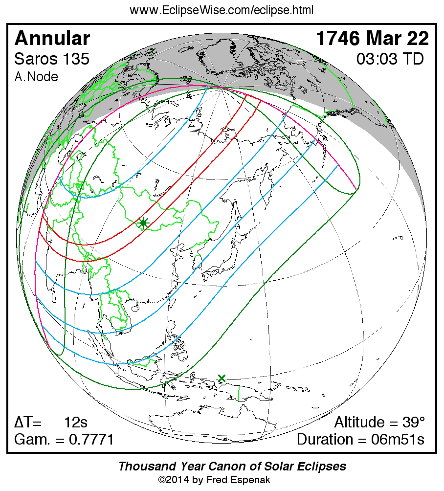 - Path Table: Annular Solar Eclipse of 1746 Mar 22 - coordinates of the central line and path limits