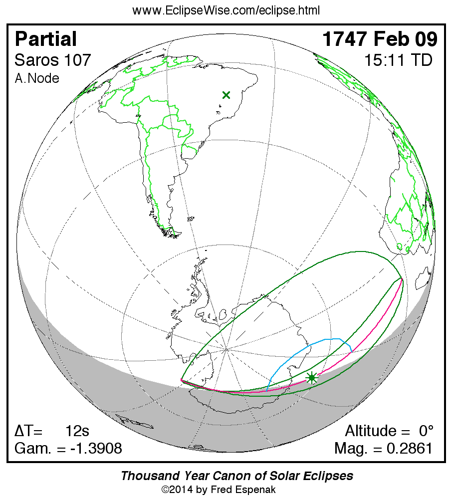 The instant of greatest eclipse takes place on 1747 Feb 09 at 15:11:17 TD (15:11:05 UT1).