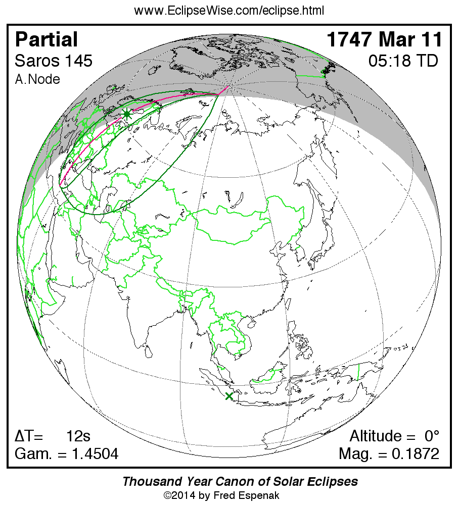 The instant of greatest eclipse takes place on 1747 Mar 11 at 05:18:08 TD (05:17:56 UT1).