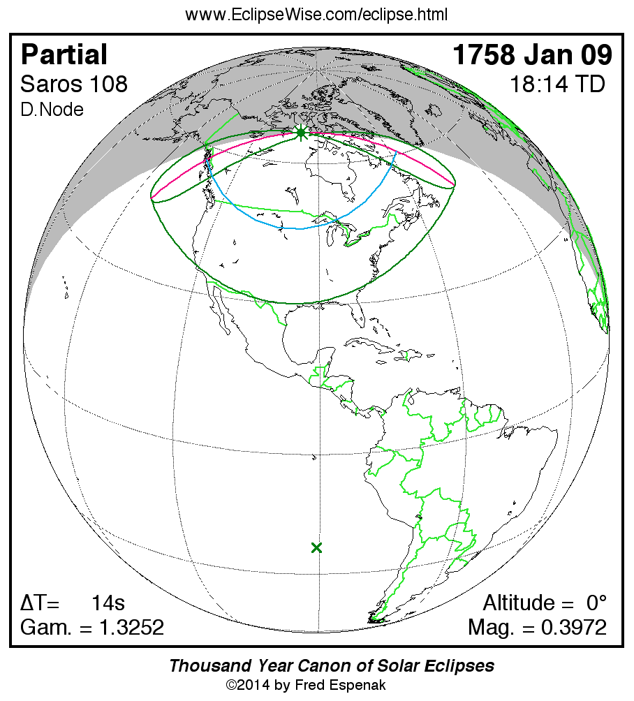 The instant of greatest eclipse takes place on 1758 Jan 09 at 18:13:42 TD (18:13:28 UT1).
