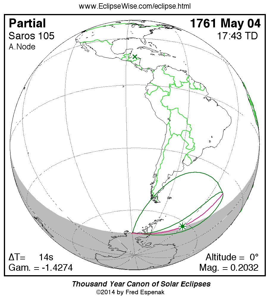 The instant of greatest eclipse takes place on 1761 May 04 at 17:43:11 TD (17:42:57 UT1).