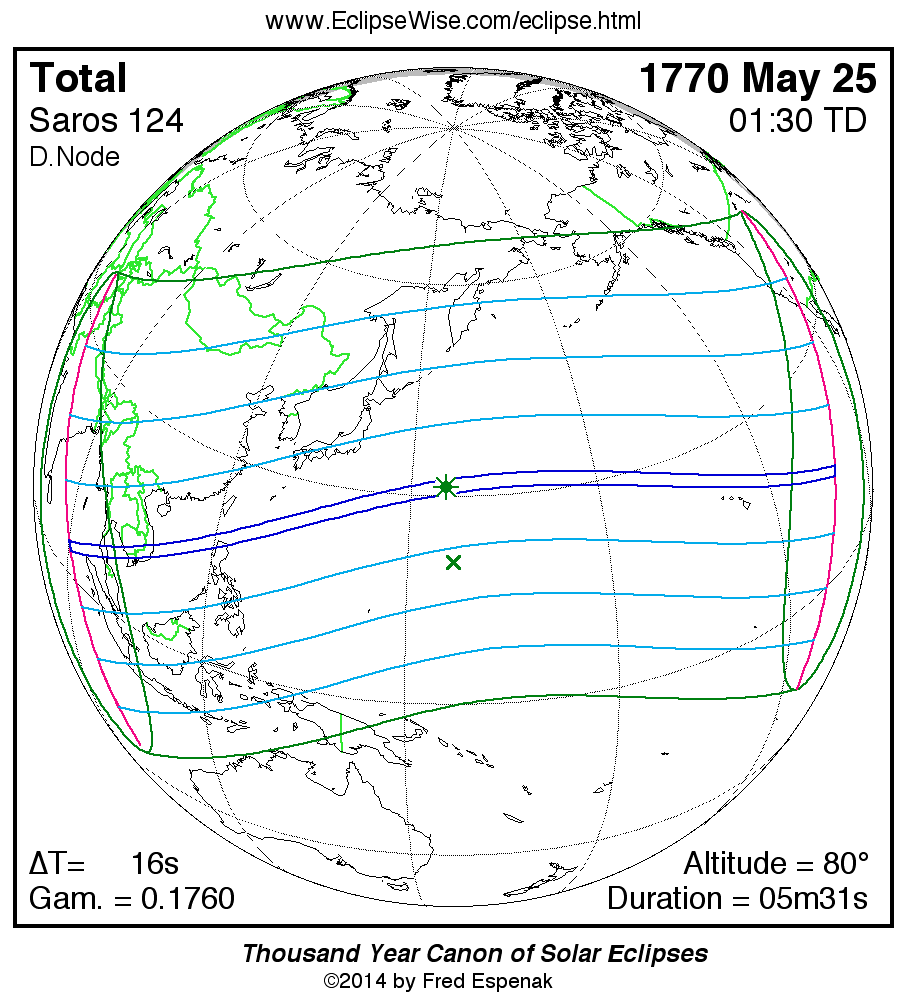 - Path Table: Total Solar Eclipse of 1770 May 25 - coordinates of the central line and path limits