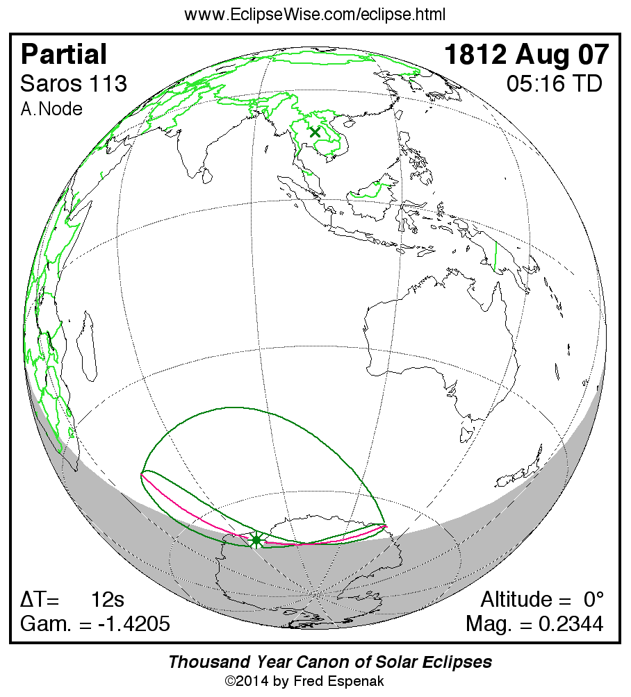 The instant of greatest eclipse takes place on 1812 Aug 07 at 05:15:50 TD (05:15:37 UT1).