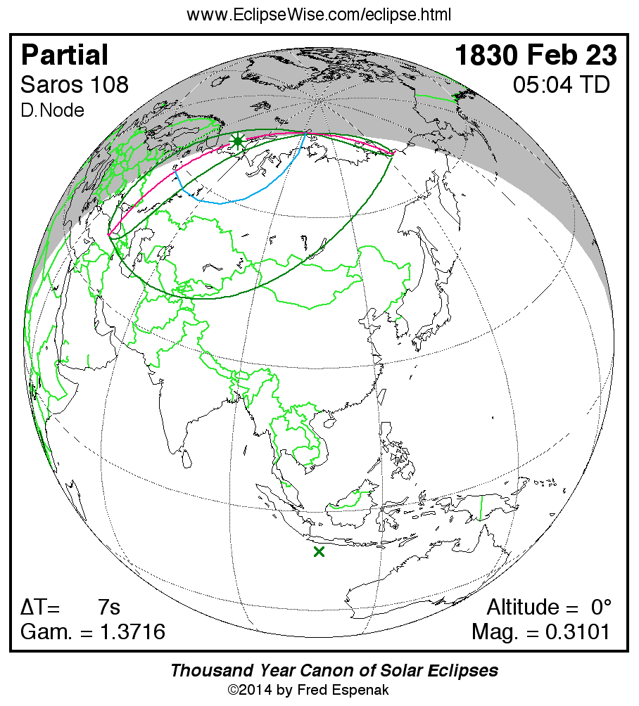 The instant of greatest eclipse takes place on 1830 Feb 23 at 05:04:13 TD (05:04:05 UT1).