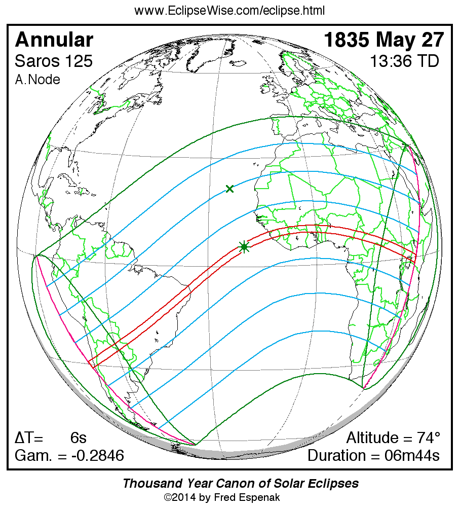 - Path Table: Annular Solar Eclipse of 1835 May 27 - coordinates of the central line and path limits