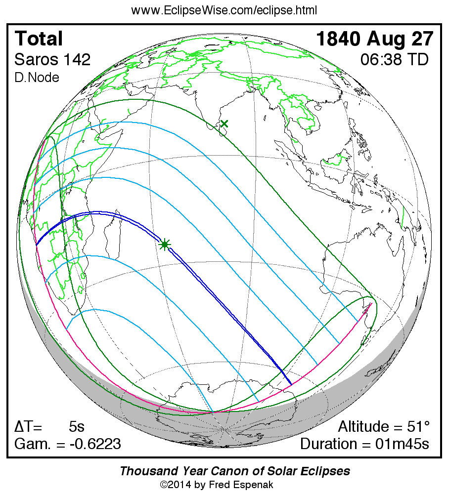 The instant of greatest eclipse takes place on 1840 Aug 27 at 06:37:32 TD (06:37:27 UT1).