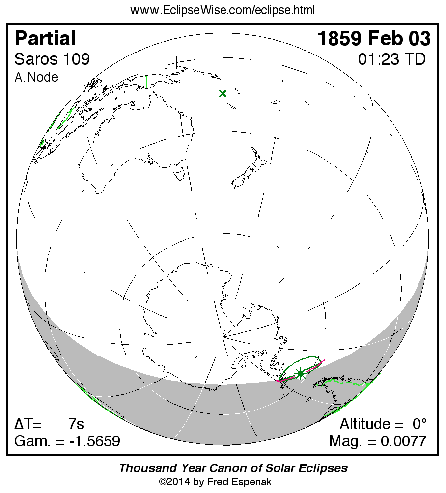 The eclipse belongs to Saros 109 and is number 81 of 81 eclipses in the series. Thus, the 1859 Feb 03 event is the last eclipse of the series . All eclipses in this series occur at the Moons ascending node. The Moon moves southward with respect to the node with each succeeding eclipse in the series and gamma decreases.