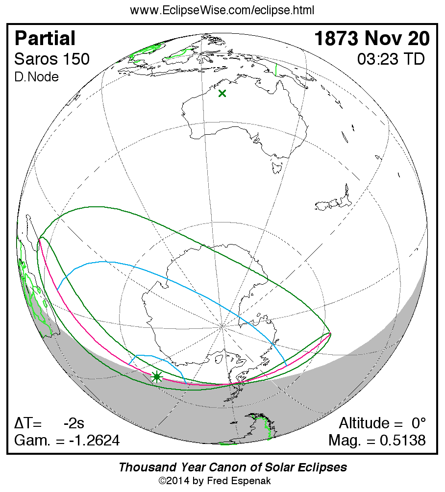 The instant of greatest eclipse takes place on 1873 Nov 20 at 03:22:52 TD (03:22:55 UT1).