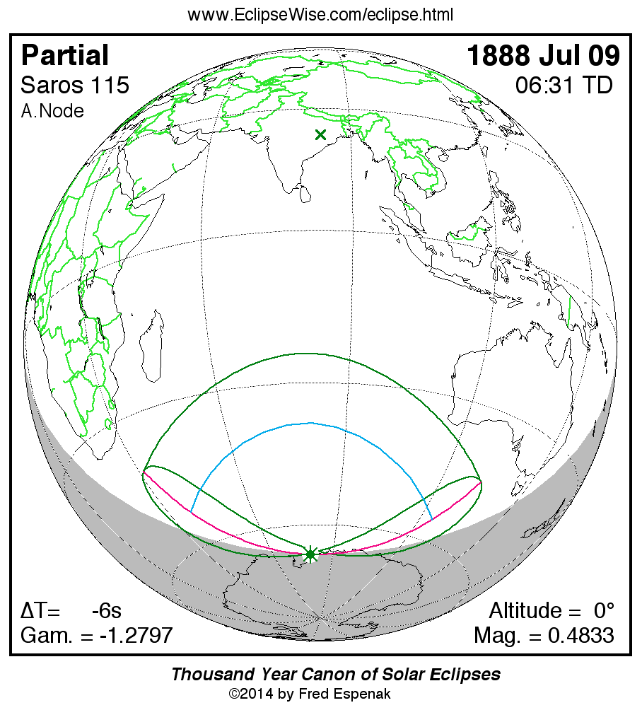 The instant of greatest eclipse takes place on 1888 Jul 09 at 06:30:52 TD (06:30:58 UT1).