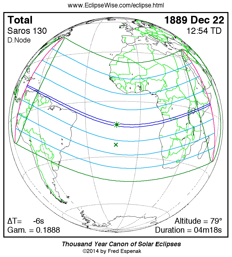 - Path Table: Total Solar Eclipse of 1889 Dec 22 - coordinates of the central line and path limits