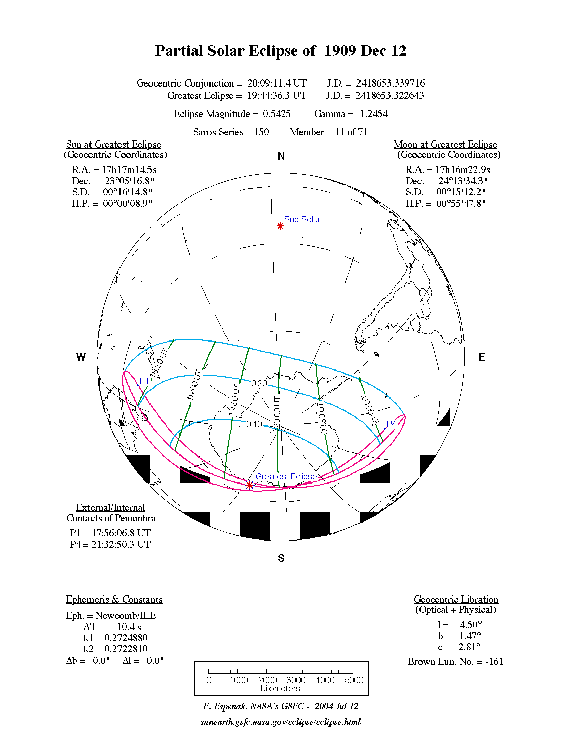 - Orthographic Map: Partial Solar Eclipse of 1909 Dec 12 - detailed global map of eclipse visibility (Key to Figure)