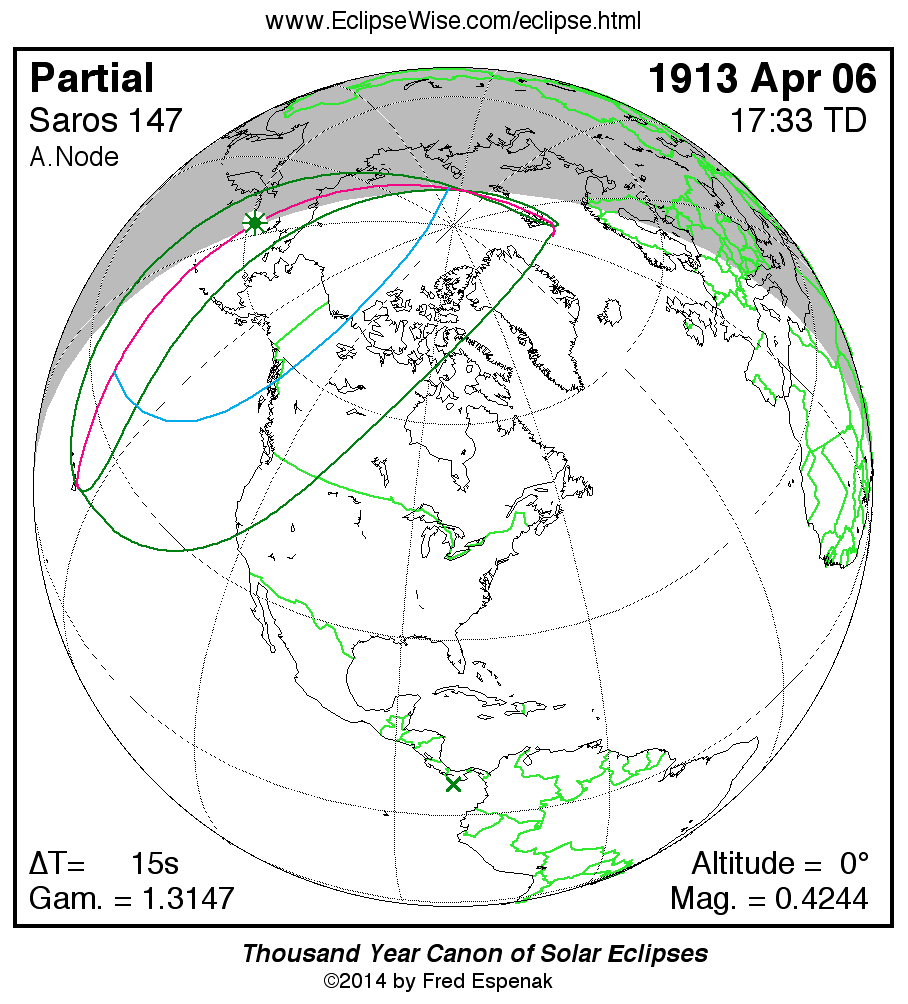 - Orthographic Map: Partial Solar Eclipse of 1913 Apr 06 - detailed global map of eclipse visibility (Key to Figure)