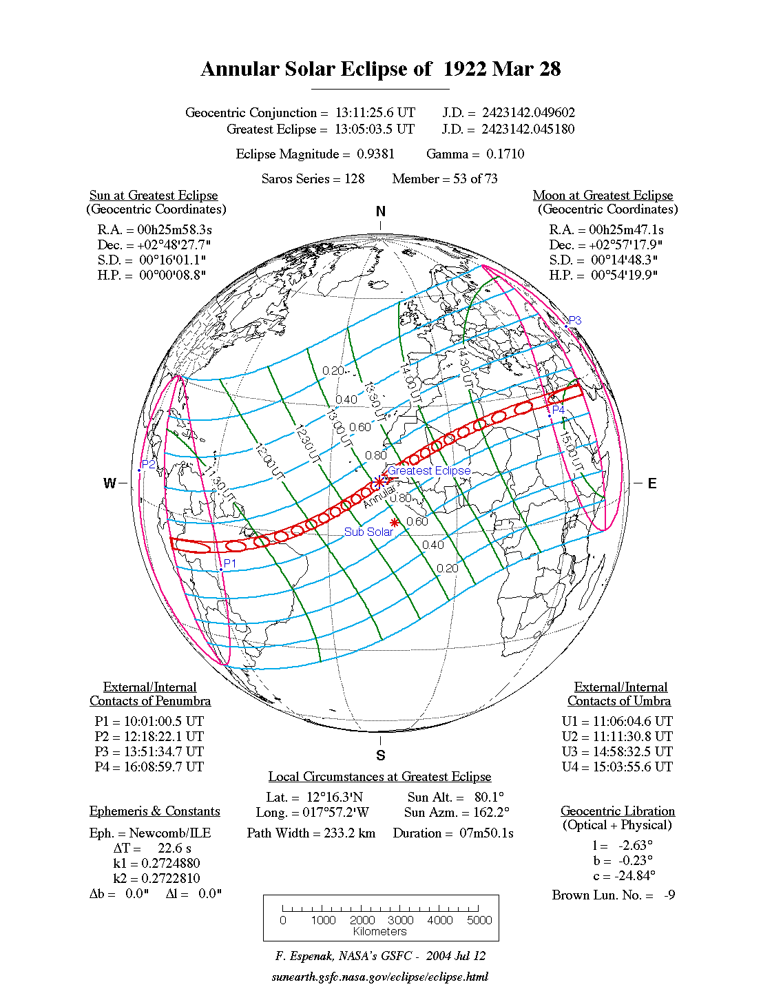 - Path Table: Annular Solar Eclipse of 1922 Mar 28 - coordinates of the central line and path limits