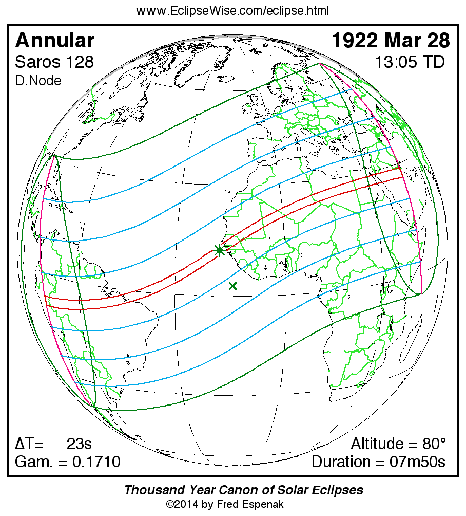 - Orthographic Map: Annular Solar Eclipse of 1922 Mar 28 - detailed global map of eclipse visibility (Key to Figure)