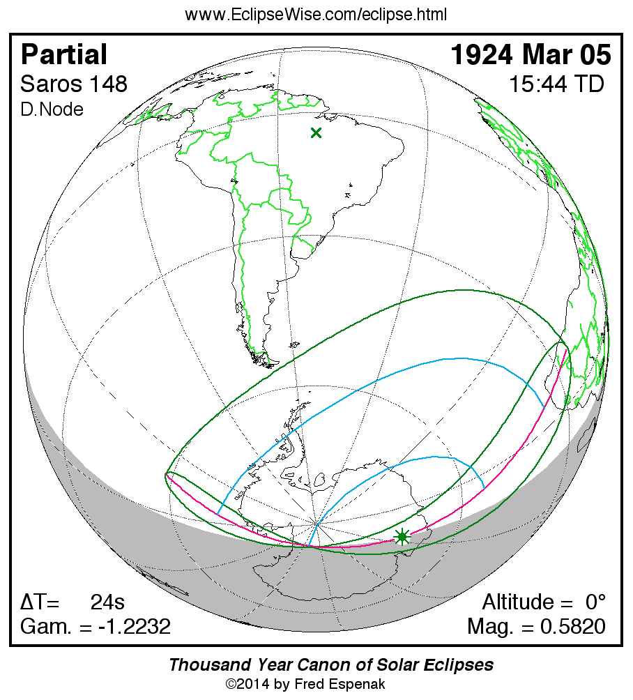 - Orthographic Map: Partial Solar Eclipse of 1924 Mar 05 - detailed global map of eclipse visibility (Key to Figure)