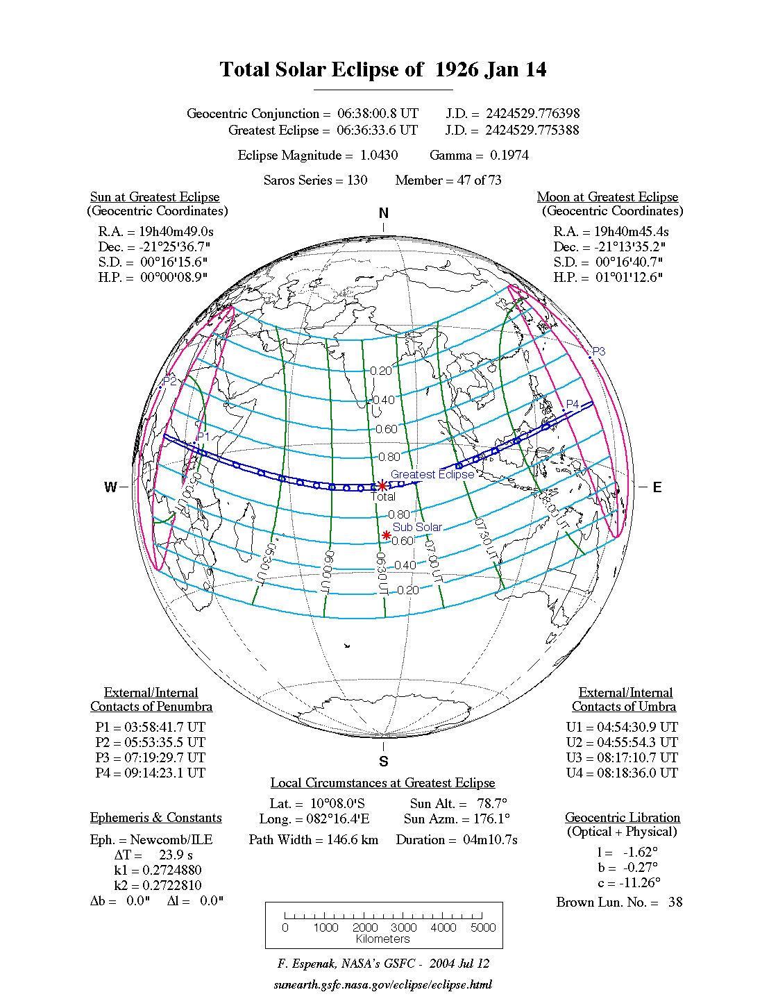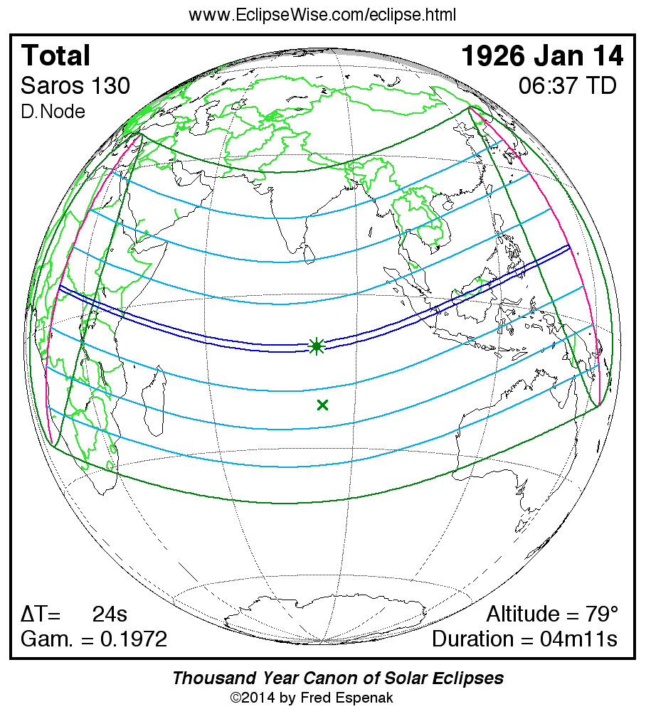 - Path Table: Total Solar Eclipse of 1926 Jan 14 - coordinates of the central line and path limits