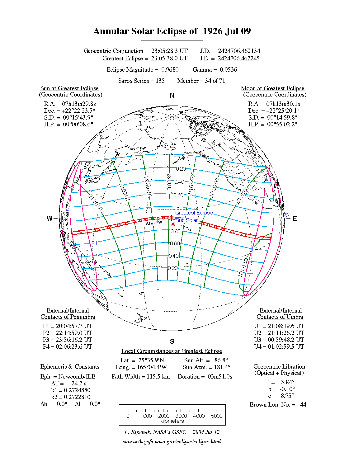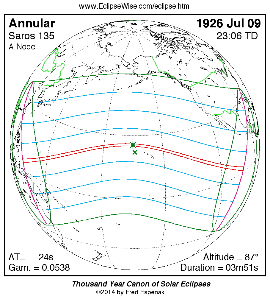 - Path Table: Annular Solar Eclipse of 1926 Jul 09 - coordinates of the central line and path limits