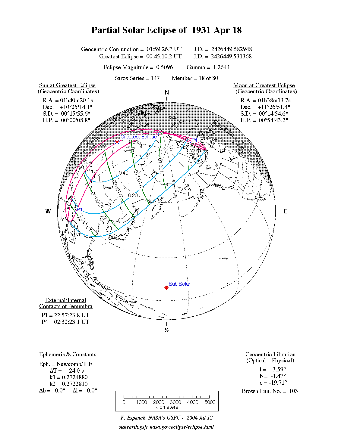 - Orthographic Map: Partial Solar Eclipse of 1931 Apr 18 - detailed global map of eclipse visibility (Key to Figure)