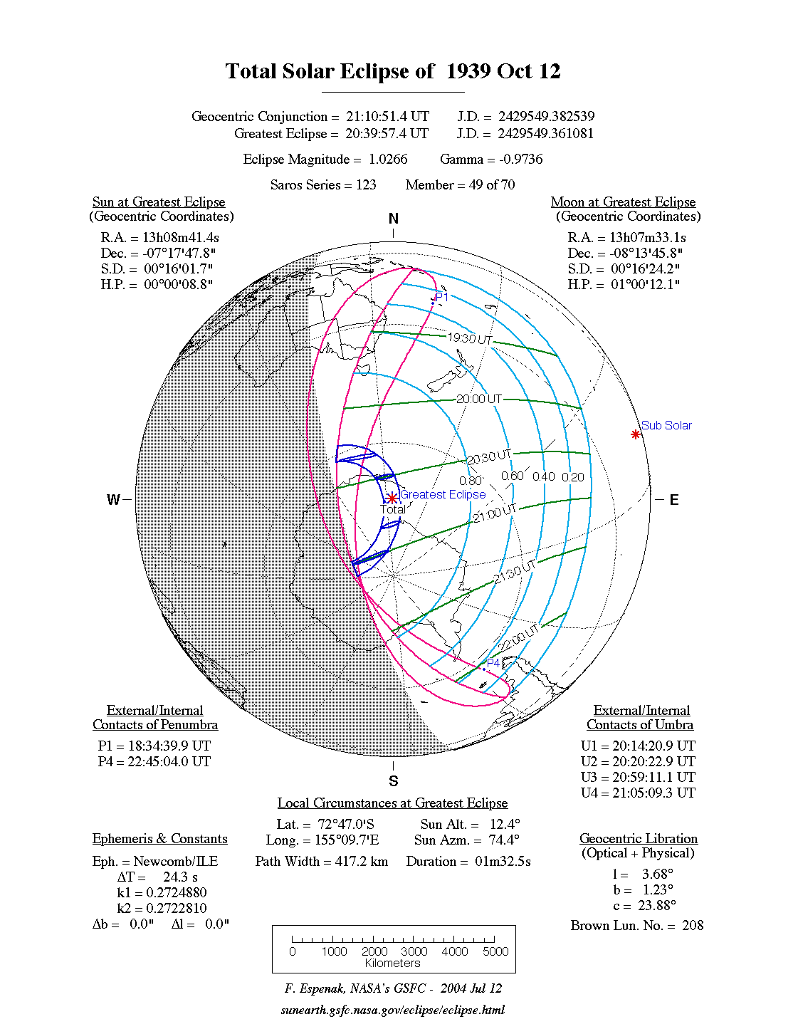 - Path Table: Total Solar Eclipse of 1939 Oct 12 - coordinates of the central line and path limits