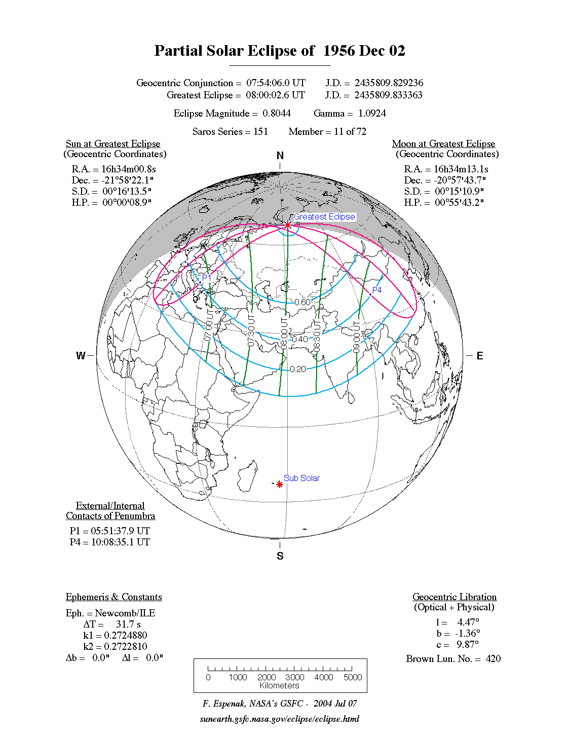 | Greatest Eclipse | 1956 Dec 02 at 08:00:35.0 TD (08:00:03.4 UT1) | 2435809.833372 |
