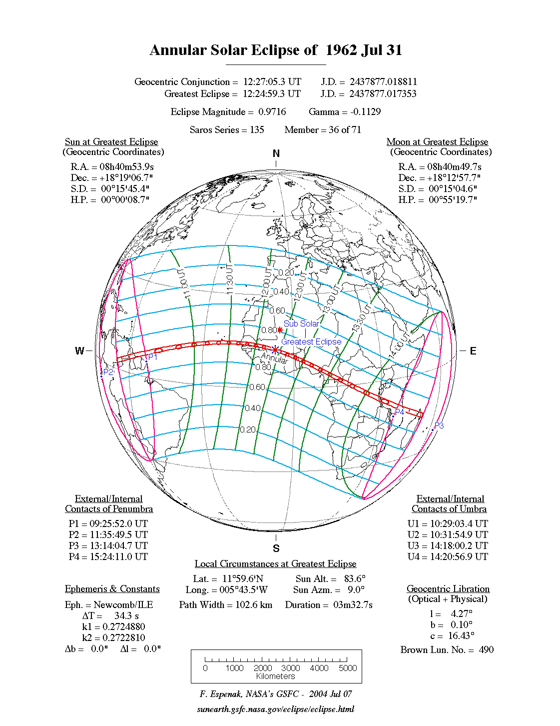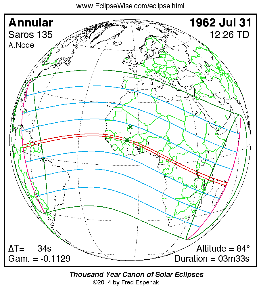 - Path Table: Annular Solar Eclipse of 1962 Jul 31 - coordinates of the central line and path limits