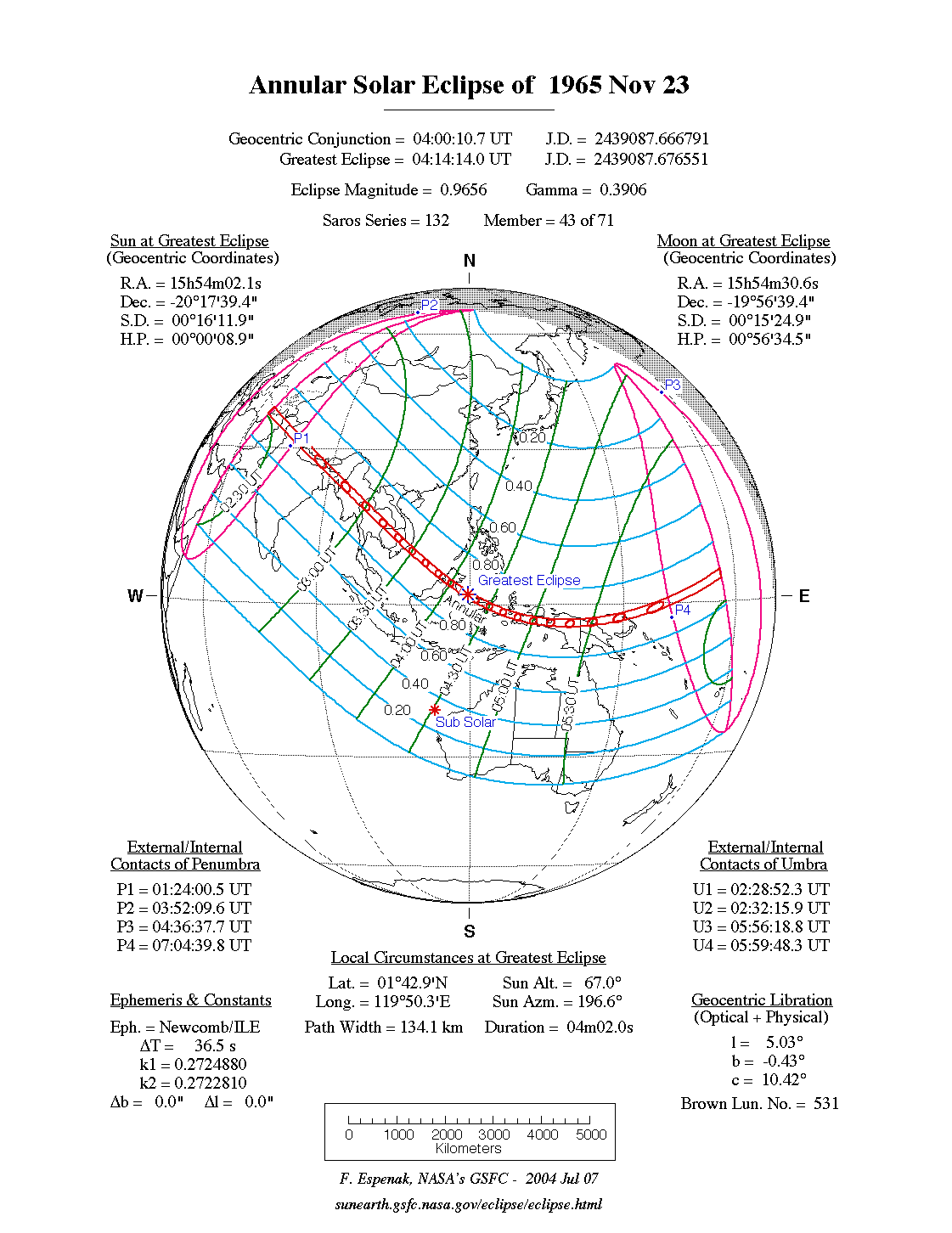 - Path Table: Annular Solar Eclipse of 1965 Nov 23 - coordinates of the central line and path limits