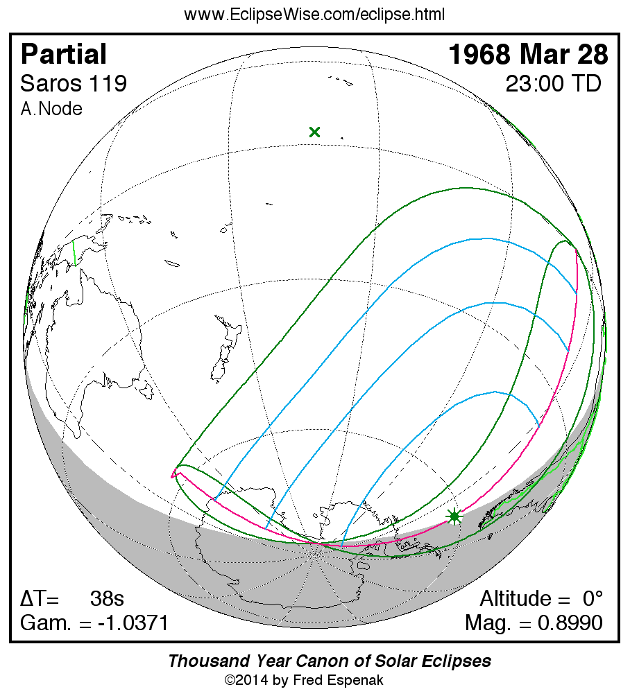- Orthographic Map: Partial Solar Eclipse of 1968 Mar 28 - detailed global map of eclipse visibility (Key to Figure)