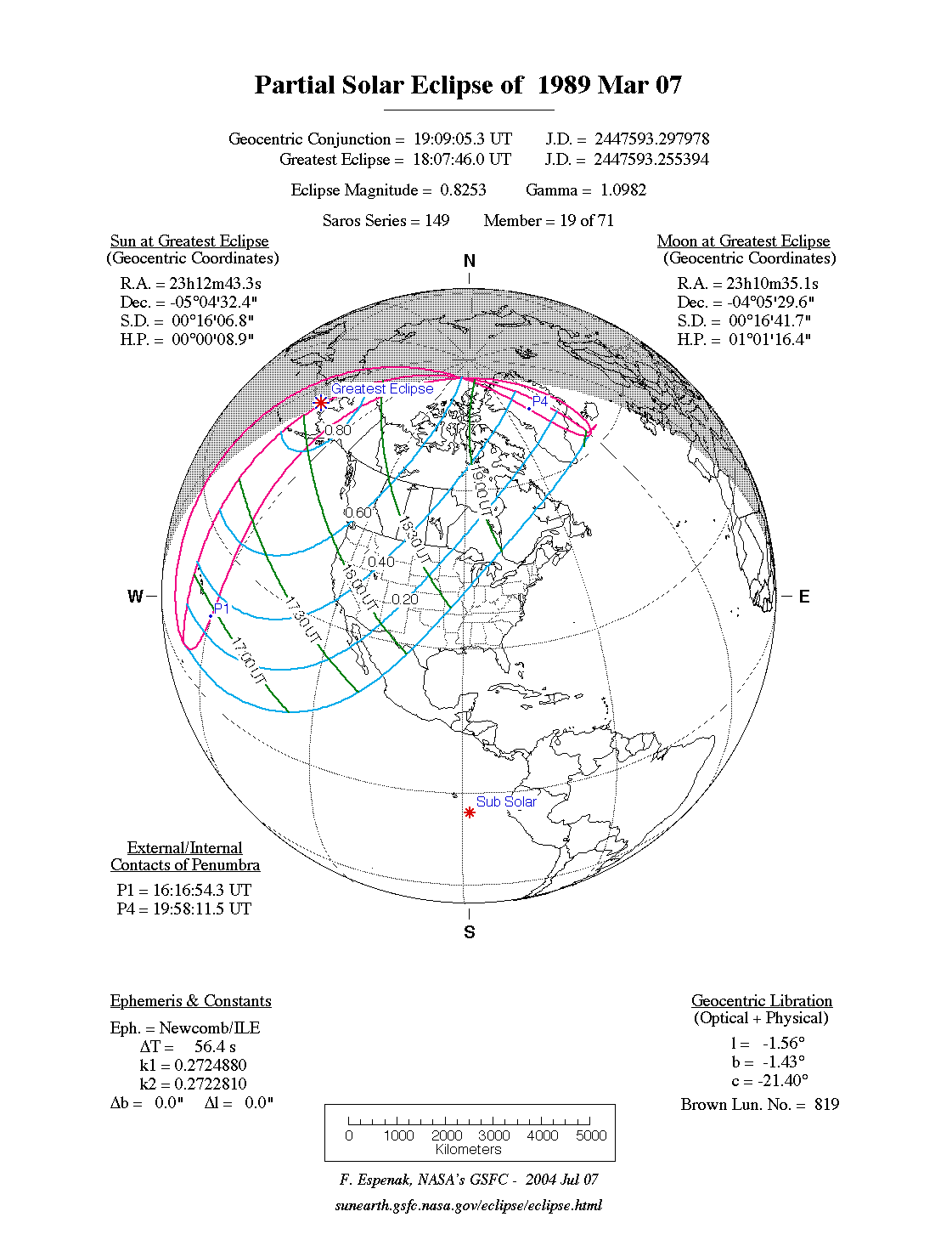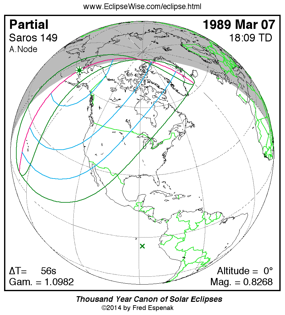 - Orthographic Map: Partial Solar Eclipse of 1989 Mar 07 - detailed global map of eclipse visibility (Key to Figure)