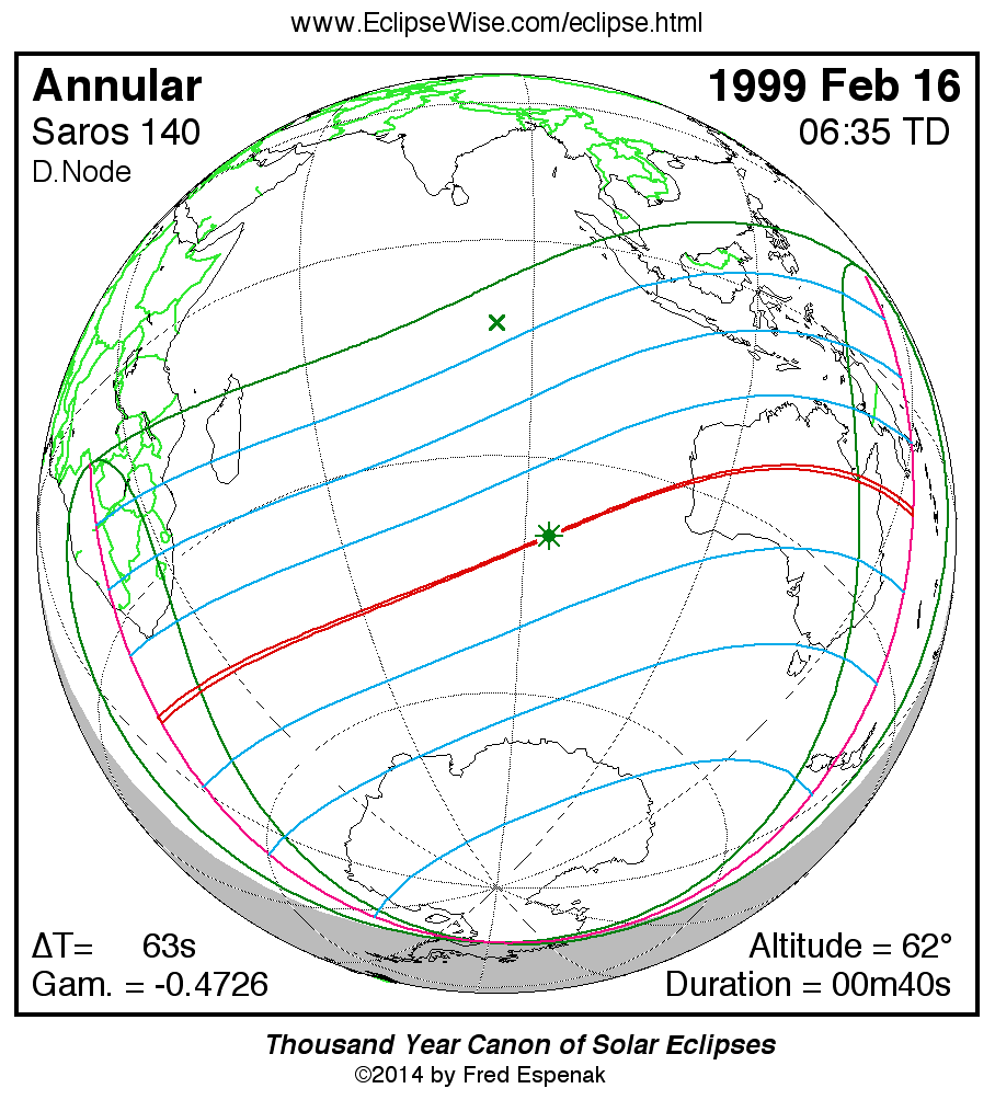 - Orthographic Map: Annular Solar Eclipse of 1999 Feb 16 - detailed global map of eclipse visibility (Key to Figure)