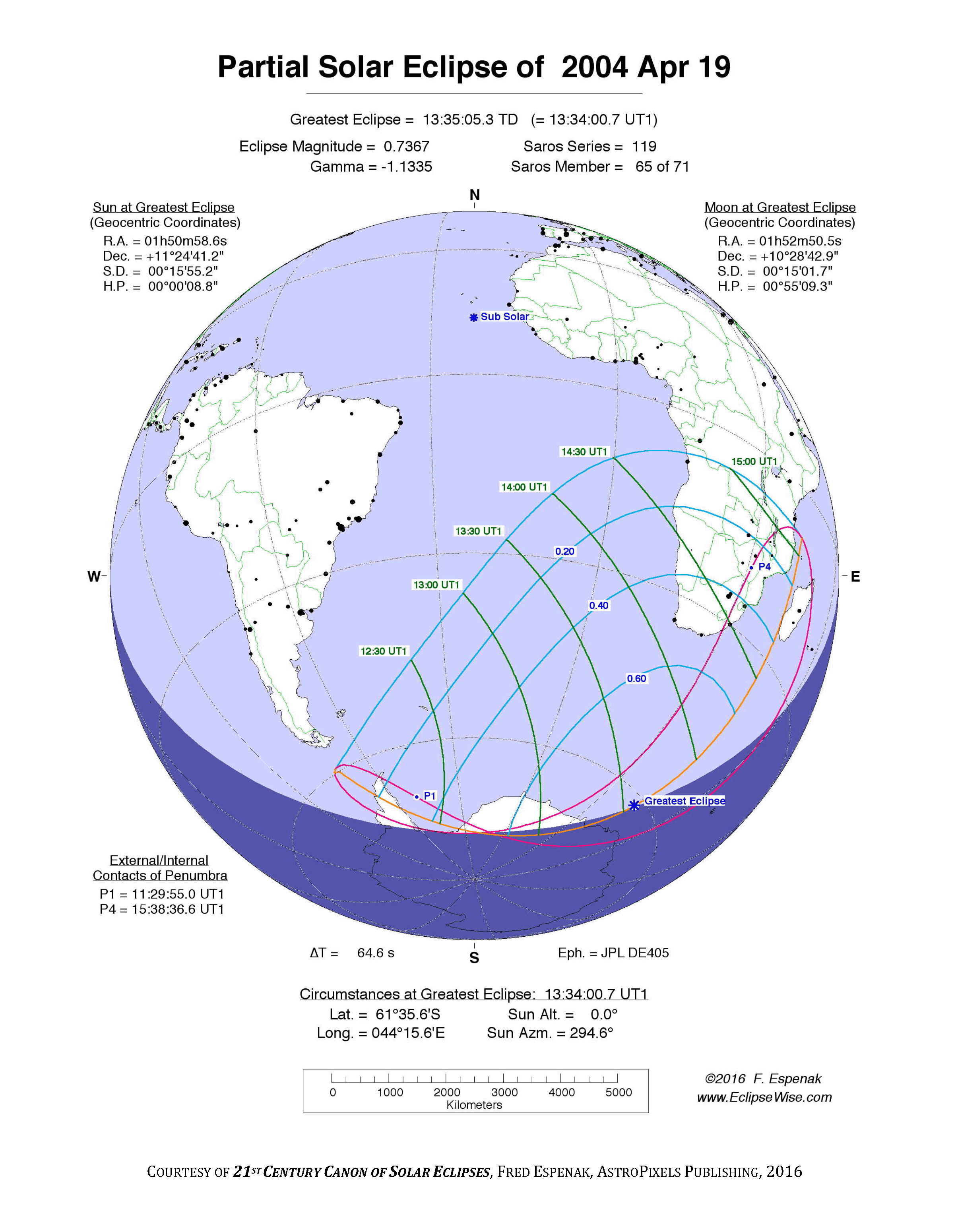 - Orthographic Map: Partial Solar Eclipse of 2004 Apr 19 - detailed global map of eclipse visibility (Key to Figure)