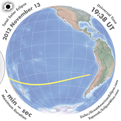 The map to the right shows a single frame from the medium size animation for the Total Solar Eclipse of 2012 Nov 13 . In the upper left corner is the type of eclipse and the eclipse date. To the upper right is the Universal Time. The lower left corner displays the instantaneous duration of totality. To the lower right is the credit for the animation.