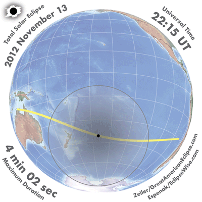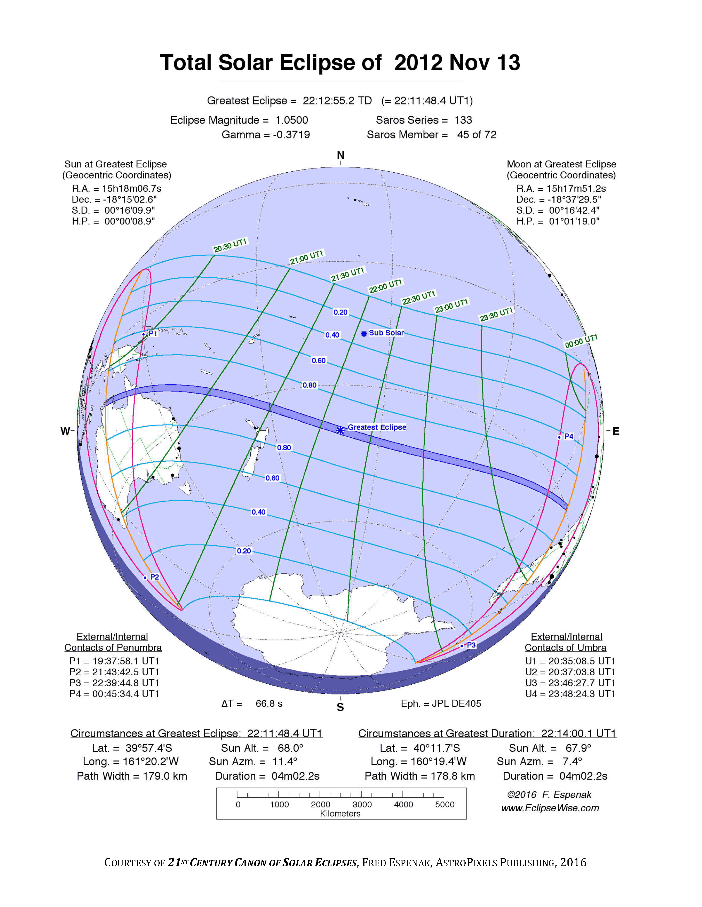 - Orthographic Map: Total Solar Eclipse of 2012 Nov 13 - detailed global map of eclipse visibility (Key to Figure)
