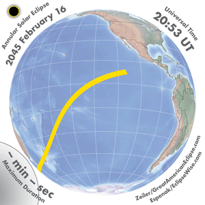 The map to the right shows a single frame from the medium size animation for the Annular Solar Eclipse of 2045 Feb 16 . In the upper left corner is the type of eclipse and the eclipse date. To the upper right is the Universal Time. The lower left corner displays the instantaneous duration of annularity. To the lower right is the credit for the animation.