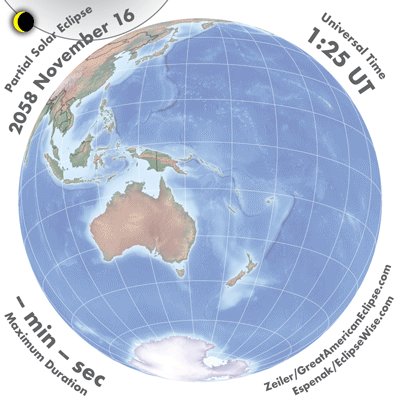 - Orthographic Map: Partial Solar Eclipse of 2058 Nov 16 - detailed global map of eclipse visibility (Key to Figure)