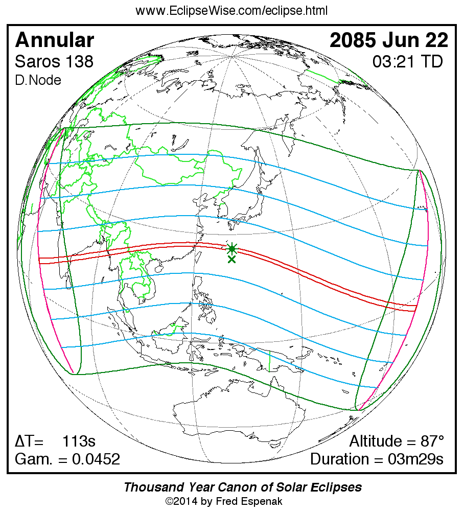 - Orthographic Map: Annular Solar Eclipse of 2085 Jun 22 - detailed global map of eclipse visibility (Key to Figure)