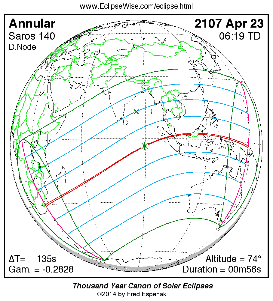 The instant of greatest eclipse takes place on 2107 Apr 23 at 06:18:41 TD (06:16:26 UT1).