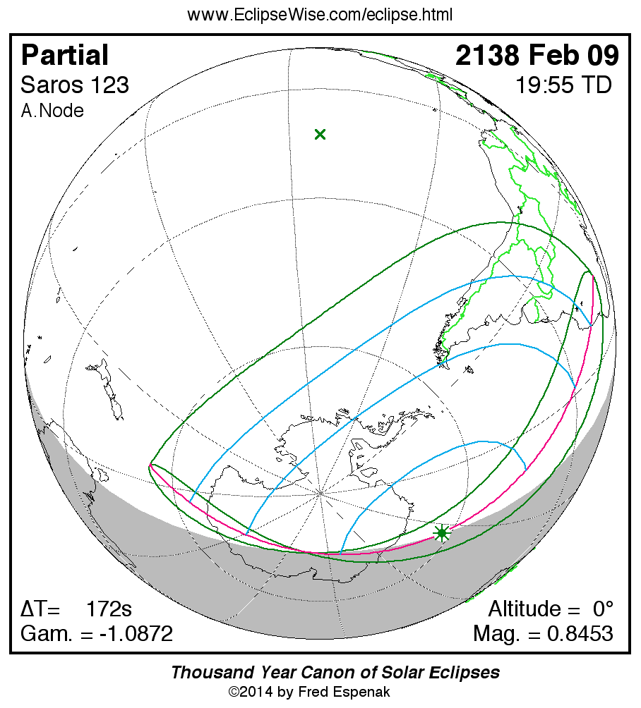 The instant of greatest eclipse takes place on 2138 Feb 09 at 19:55:23 TD (19:52:31 UT1).