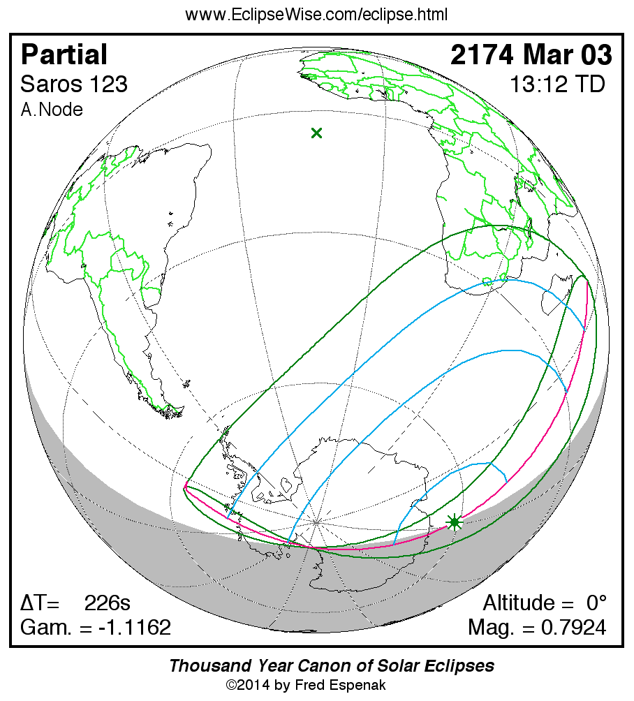 The instant of greatest eclipse takes place on 2174 Mar 03 at 13:11:54 TD (13:08:09 UT1).
