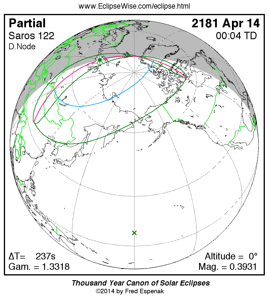 The instant of greatest eclipse takes place on 2181 Apr 14 at 00:04:05 TD (00:00:08 UT1).