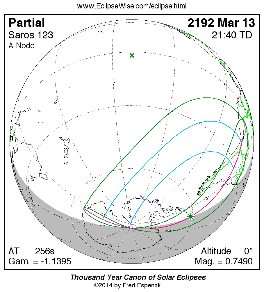The instant of greatest eclipse takes place on 2192 Mar 13 at 21:39:60 TD (21:35:43 UT1).